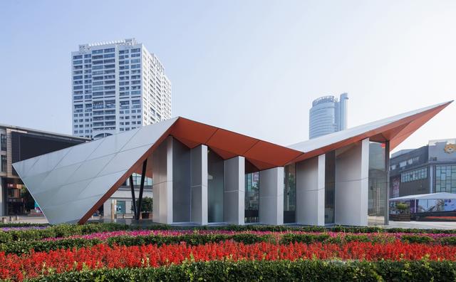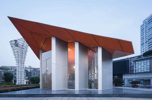 該建筑位于寧波市天一廣場,占地面積僅178平方,整體建筑材料采用鋼管和鋁單板,建筑拋棄曲面屋頂采用折疊形式,整體呈現(xiàn)不規(guī)則幾何形態(tài),屋頂轉(zhuǎn)換也因使用功能而變化,整體造型像紙一樣折疊。由于整個建筑采用鋁板和鋼結構,從設計到施工只需要一個月。