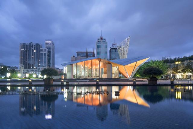 該建筑位于寧波市天一廣場,占地面積僅178平方,整體建筑材料采用鋼管和鋁單板,建筑拋棄曲面屋頂采用折疊形式,整體呈現(xiàn)不規(guī)則幾何形態(tài),屋頂轉(zhuǎn)換也因使用功能而變化,整體造型像紙一樣折疊。由于整個建筑采用鋁板和鋼結構,從設計到施工只需要一個月。